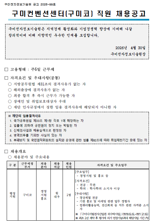 | 제목 | [구미코] 구미컨벤션센터(구미코) 직원 채용공고 |