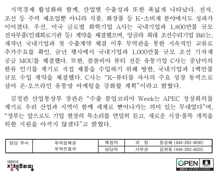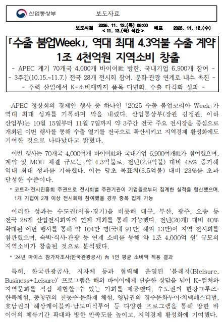 | 제목 | 「수출 붐업Week」, 역대 최대 4.3억불 수출 계약 1조 4천억원 지역소비 창출 |