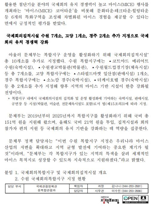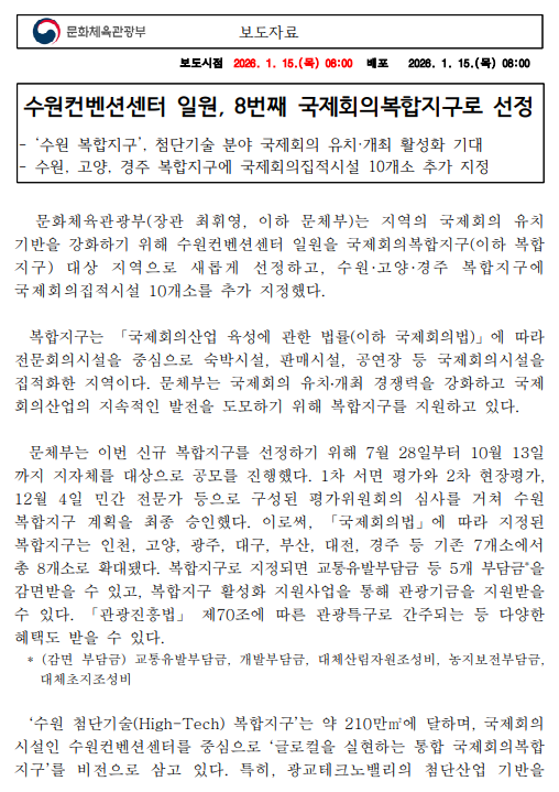 - [0115]문체부보도자료-국제회의복합지구와 국제회의집적시설 신규 지정.pdf (413.9K) 0회 다운로드 | DATE : 2026-01-15 10:36:41