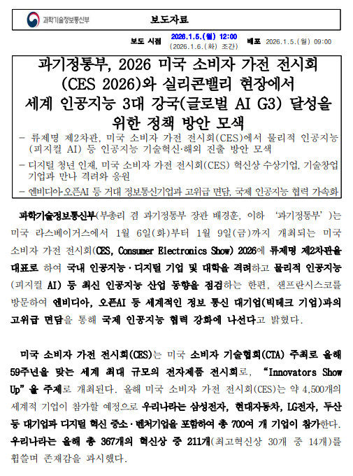 - 260106 조간 보도 과기정통부, CES 2026과 실리콘밸리서 글로벌 AI G3 달성을 위한 정책방안 모색수정.hwpx (128.0K) 18회 다운로드 | DATE : 2026-01-06 09:46:20