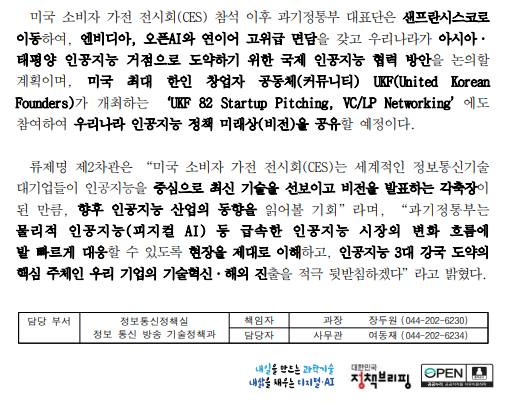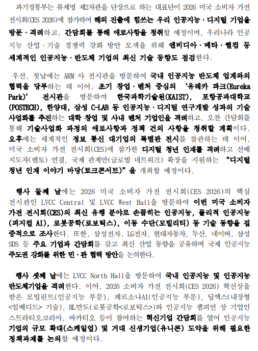 | 제목 | (과기부) 2026 미국 소비자 가전 전시회 (CES 2026)와 실리콘밸리 현장에서 세계 인공지능 3대 강국(글로벌 AI G3) 달성을 위한 정책 방안 모색 |