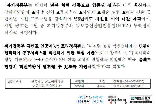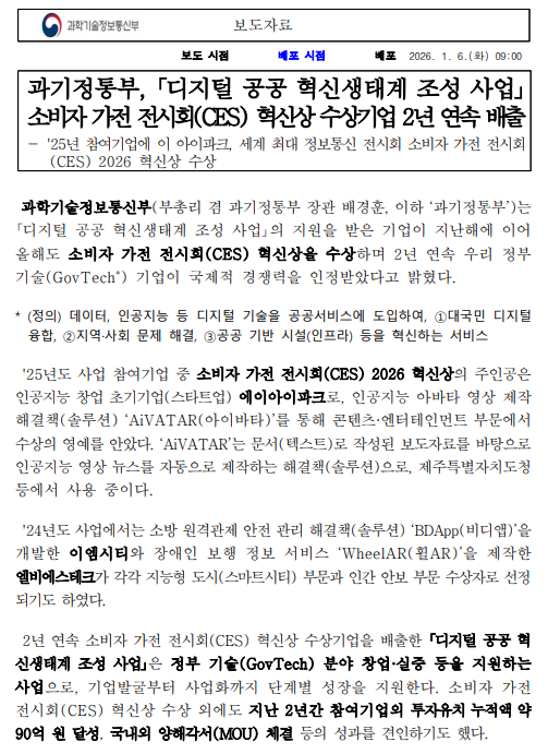- 260106 즉시 보도 과기정통부, 「디지털 공공 혁신생태계 조성 사업」 CES 혁신상 수상 기업 2년 연속 배출 쾌거수정.hwpx (144.4K) 9회 다운로드 | DATE : 2026-01-07 10:16:13