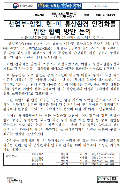 - 021112석간투자정책과, 산업부-암참, 한-미 통상환경 안정화를 위한 협력 방안 논의.pdf (151.5K) 0회 다운로드 | DATE : 2026-02-13 09:50:56