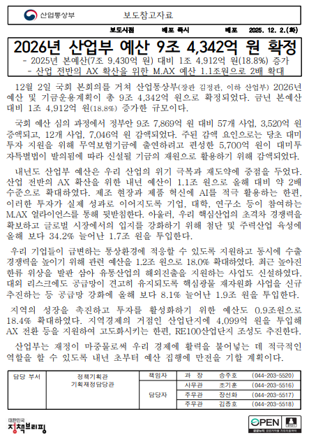 - 참고자료기획재정담당관실, 2026년 산업부 예산 9조 4,342억 원 확정.pdf (291.5K) 4회 다운로드 | DATE : 2025-12-03 10:17:00
