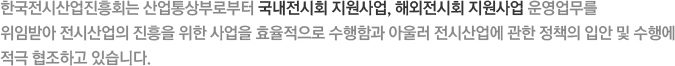 주한외국공관초청설명회 | 산업통상부 중소벤처기업부 소상공인시장진흥공단 | 전시장 온라인 등록시스템 전시UP 전시산업 구인구직 전시회 정보포털 쇼알라 GEP글로벌전시포털 전시장안전관리교육시스템 한국전시디자인연감 전시산업 인력양성 및 교육 |