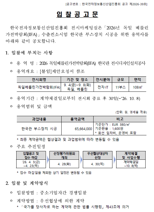 | 제목 | [한국전자정보통신산업진흥회] 2026 독일베를린가전박람회(IFA) 한국관 전시디자인설치공사 입찰 공고 |