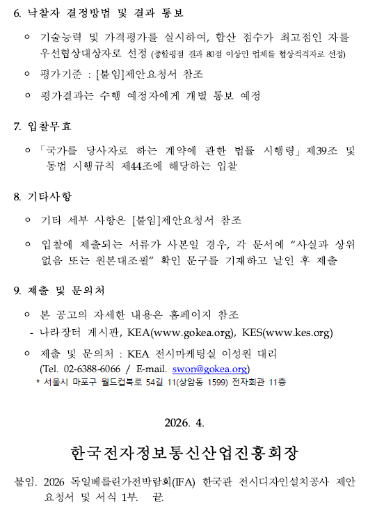 - [입찰공고문] 2026 독일베를린가전박람회IFA 한국관 전시디자인설치공사 입찰공고문.pdf (246.0K) 2회 다운로드 | DATE : 2026-04-08 09:56:10