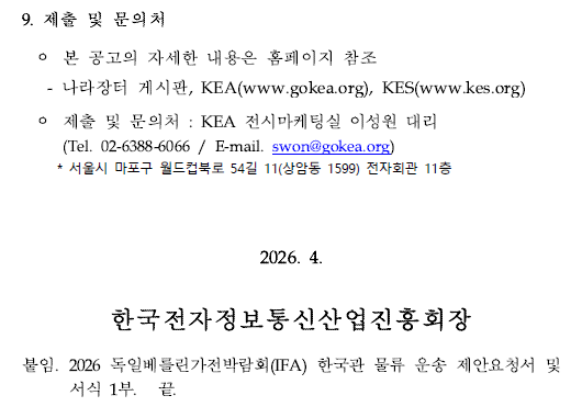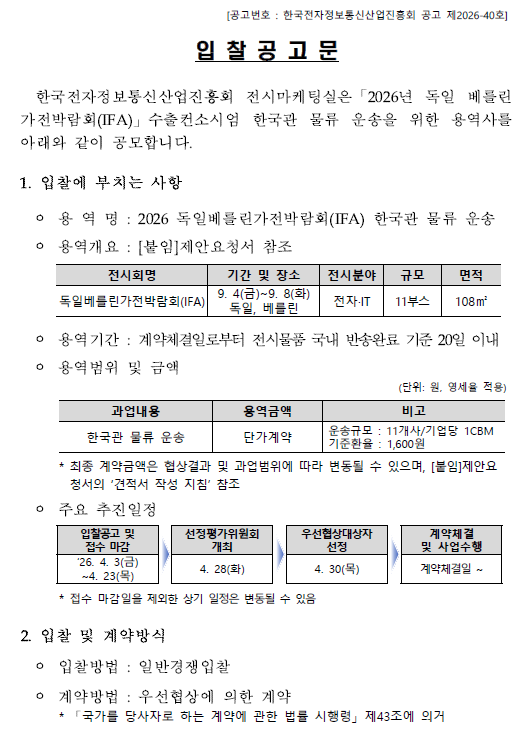 - [입찰공고문] 2026 독일베를린가전박람회IFA 한국관 물류 운송 입찰공고문.pdf (236.5K) 2회 다운로드 | DATE : 2026-04-08 09:58:40