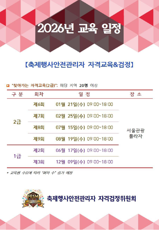 | 제목 | [한국마이스관광연구소] 2026년도 축제행사안전관리자 자격교육 및 검정 일정 안내 |