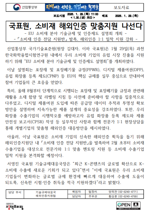 - 012930조간해외인증지원팀, 국표원, 소비재 해외인증 맞춤지원 나선다.pdf (149.2K) 0회 다운로드 | DATE : 2026-01-30 10:37:45