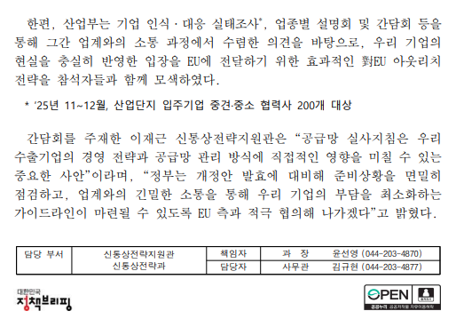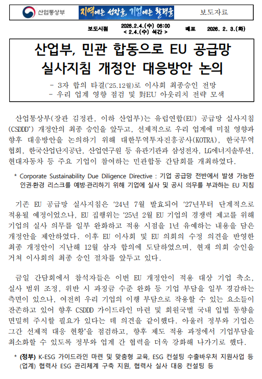 - 020304석간신통상전략과, 산업부 민관 합동으로 EU 공급망 실사지침 개정안 대응방안 논의.pdf (324.8K) 6회 다운로드 | DATE : 2026-02-05 09:49:56