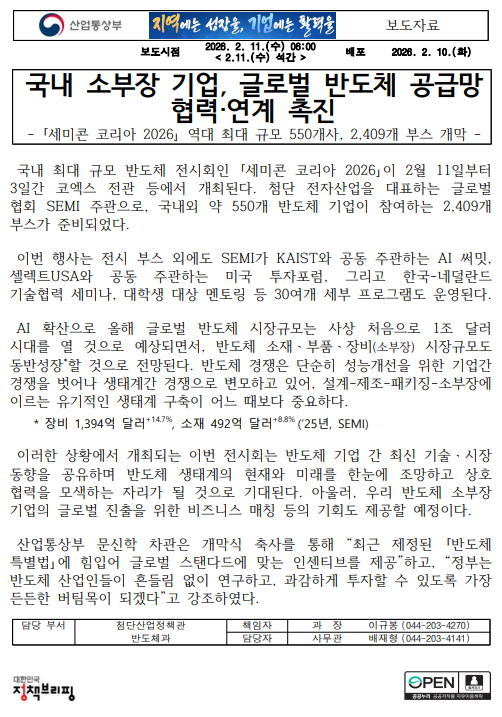 - 021011석간반도체과, 국내 소부장 기업, 글로벌 반도체 공급망 협력·연계 촉진.pdf (151.7K) 1회 다운로드 | DATE : 2026-02-11 09:29:51