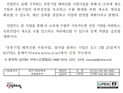 - 021011조간유통물류과, 유통망 해외진출·역직구 동시 지원으로 K-소비재 수출 판로 넓힌다.pdf (142.2K) 1회 다운로드 | DATE : 2026-02-11 09:30:40