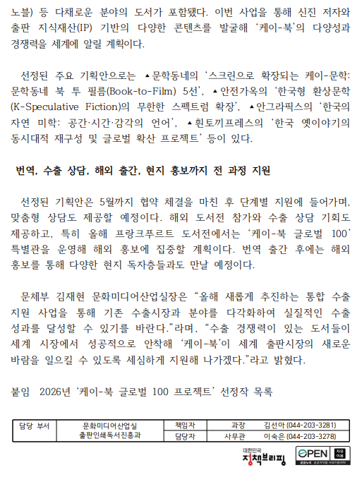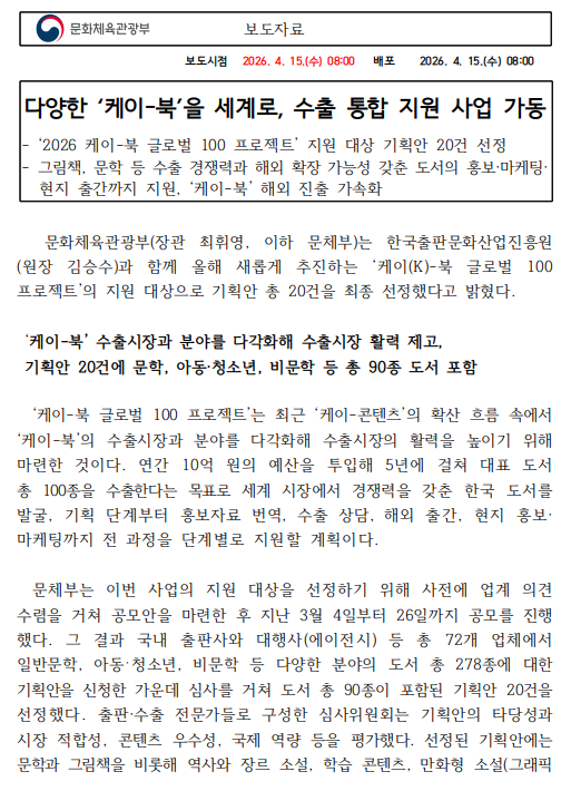 - [0415]문체부보도자료-2026 케이 북 글로벌 100 프로젝트 지원 대상 선정.PDF (488.8K) 0회 다운로드 | DATE : 2026-04-15 09:47:24